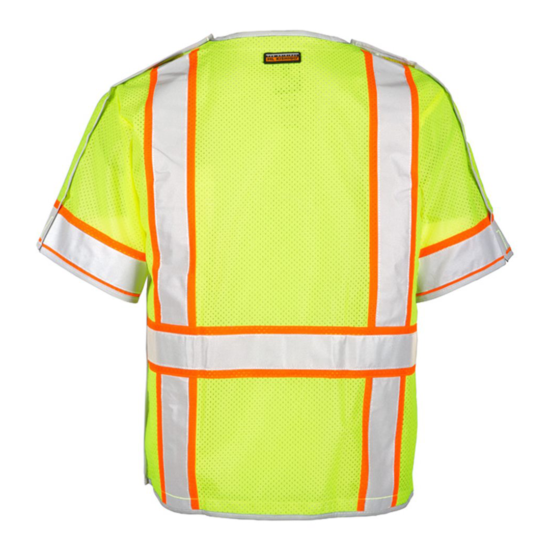 Engineered with a 5-point breakaway system, this vest quickly detaches at the shoulders, sides, and front, preventing entanglement hazards in high-traffic or machinery-intensive environments. The Brilliant Trim reflective edging and 2-inch high-performance reflective tape on a 3-inch contrasting background improve visibility in low-light conditions. With a secure hook & loop front closure, multiple pockets, mic tabs, and lapel grommets, this vest is designed for maximum functionality and efficiency on the job.